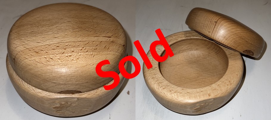Material: beech wood. Height of bowl: 4.5 cm, diameter: 12.5 cm, inner diameter (opening): approx. 8.5 cm, height of lid: 3.5 cm, diameter: 11.5 cm, surface with finish made of beeswax, carnauba wax and Treated with olive oil.