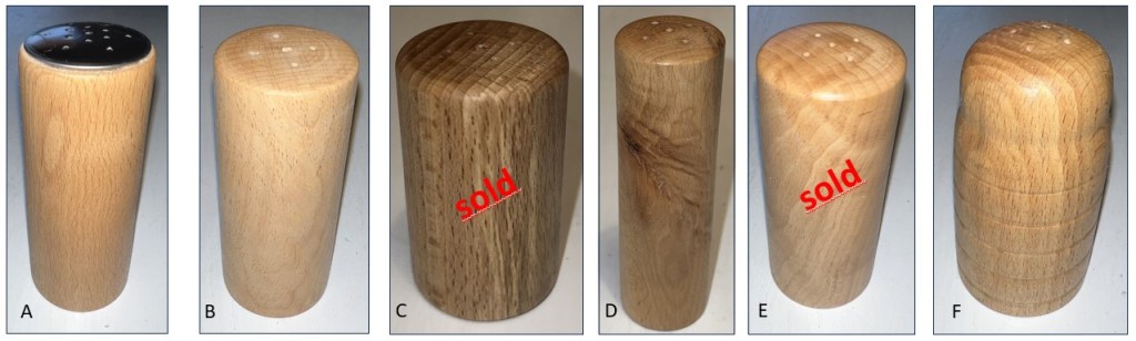 All salt shakers are made of beech wood. They were surface-treated with finish made from beeswax, carnauba wax and olive oil.