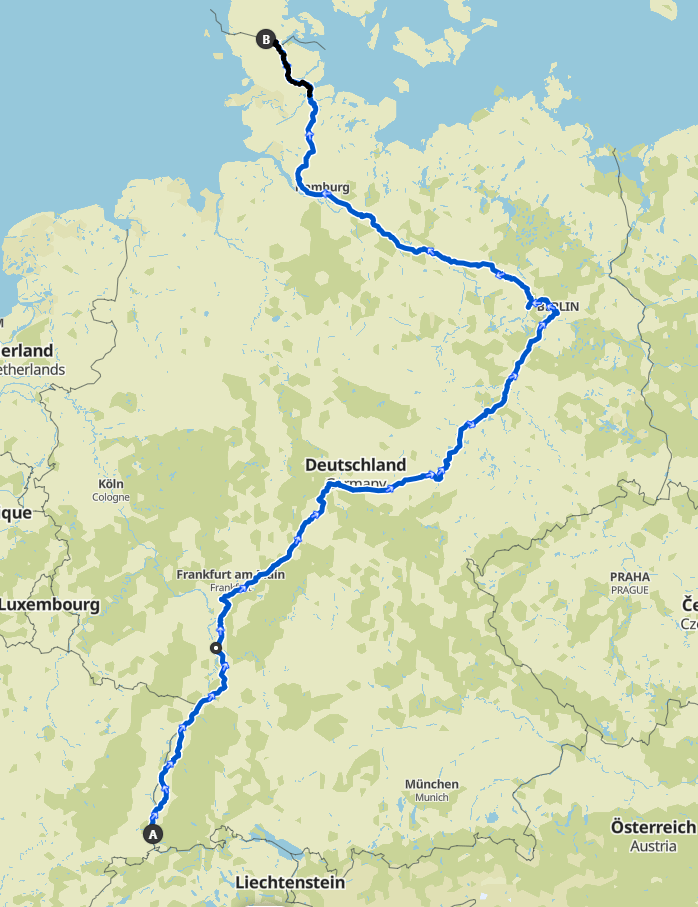 Die letzte Übernachtung erfolgte mal nicht auf einem Zeltplatz, Hotel oder sonstigem, sondern im Flix-Bus. Darüber sollte ich jetzt eigentlich garnichts schreiben, aber irgendwie gehört das doch dazu, zumal ich quasi dieselbe Strecke, die ich mit dem Fahrrad hin gefahren bin, mit dem Flix-Bus zurück fuhr. Dabei ging es am Freitag,dem 13. August 2022 um 1:10 Uhr am Morgen in Flensburg los, Ankunft bzw. Zwischenstation war um 7:40 Uhr in Berlin. Dort ein kurzer Aufenthalt mit Umstieg in einen anderen Flix- Bus, der dann um 8:20 Uhr startete und über Weimar, Würzburg, Frankfurt nach Freiburg (und weiter nach Basel) fuhr. Somit müsste ich eigentlich nur den Bus von Flensburg nach Berlin als echte Übernachtungsmöglichkeit erwähnen.