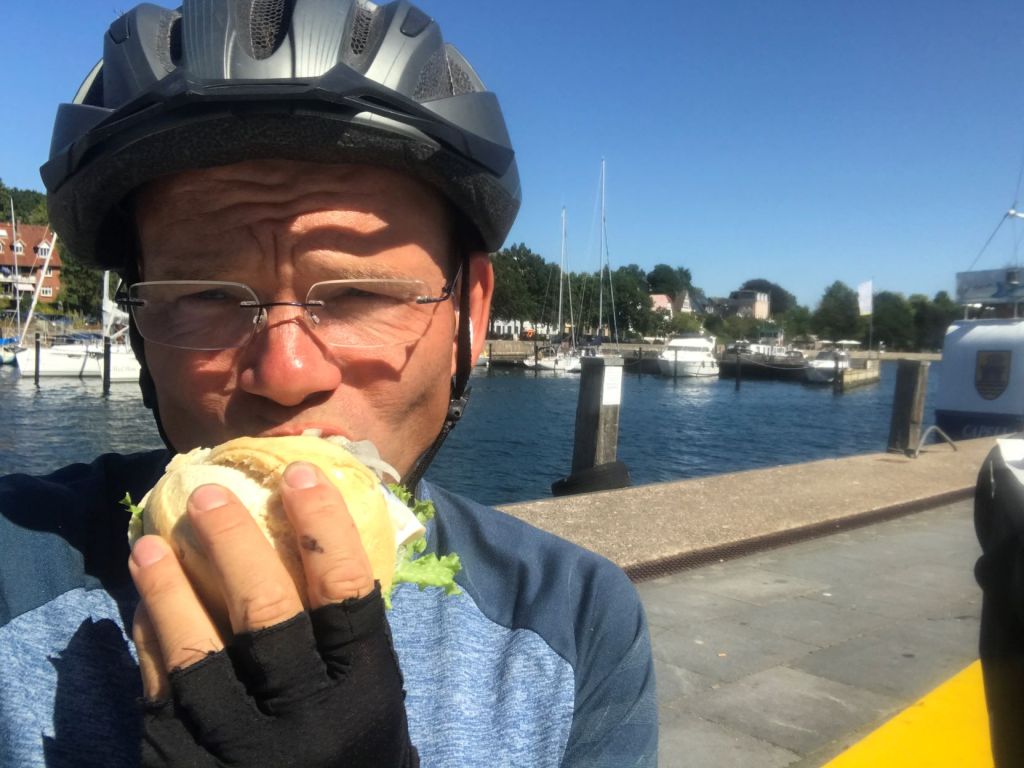 Ein Fischbrötchen zum Mittagessen im Hafen